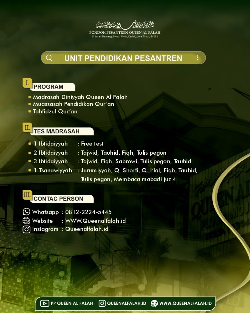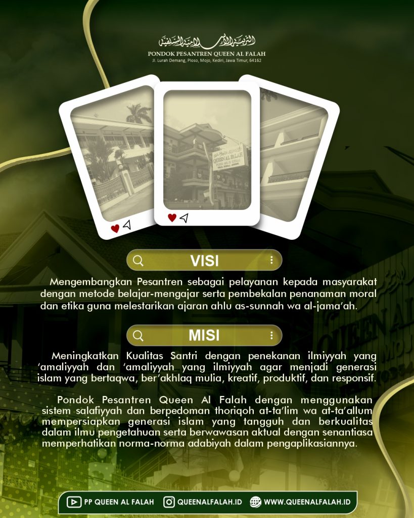 Menggunakan kitab-kitab kuning karangan ulama Salafus Shalih, PP Queen Al Falah memegang teguh prinsip Thoriqoh At Ta’lim Wa At Ta’allum, mengikuti kriteria sebagaimana pondok induk PP. Al Falah Ploso.